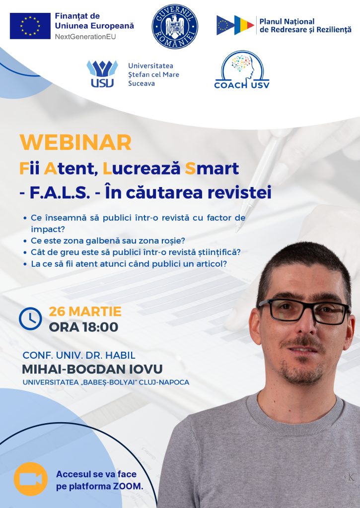 Ce înseamnă să publici într-o revistă cu factor de impact? Ce este zona galbenă sau zona roșie? Cât de greu este să publici într-o revistă științifică? La ce să fii atent atunci când publici un articol? Află răspunsurile la toate aceste întrebări din Webinar-ul ONLINE marca COACH-USV.