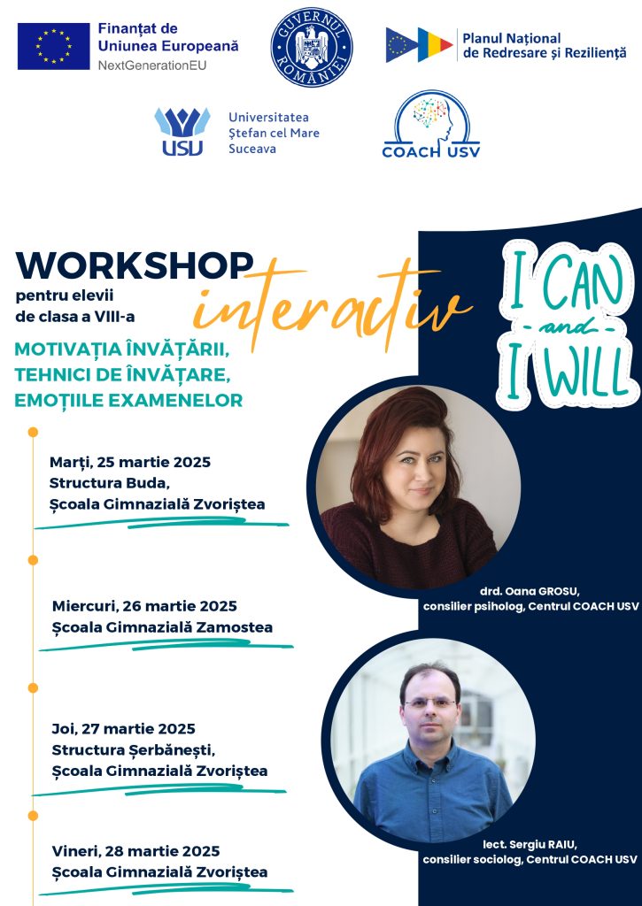 În săptămâna 24-28 martie 2025 au avut loc Vizite în școli pentru promovarea științei, astfel de-a lungul a patru zile, experții Centrului COACH-USV, Sergiu Raiu, consilier sociolog și Oana Grosu, consilier psiholog au susținut activități cu elevii de clasa a VIII-a de la Școala Gimnazială Zvoriștea, precum și structurile acestei școli din localitățile Buda și Șerbănești, dar și cu elevii de clasa a VIII-a de la Școala Gimnazială Zamostea. Aceștia au beneficiat de workshop-uri pe tema: Motivația învățării, tehnici de învățare și gestionare a emoțiilor examenelor.