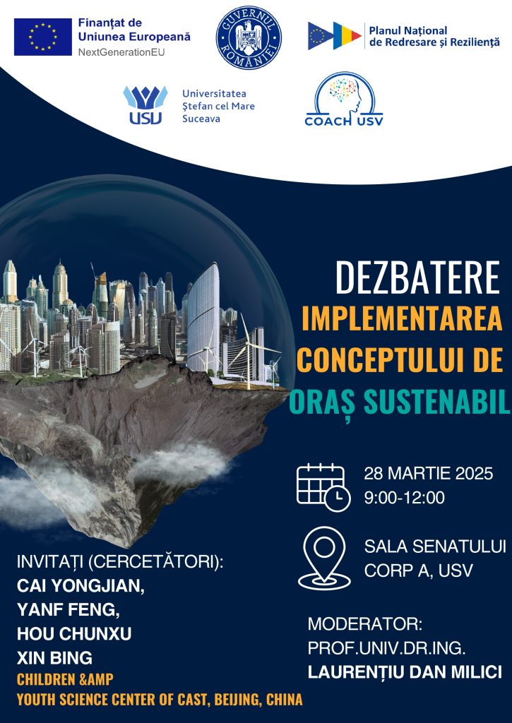 Vineri, 28 martie 2025, în interval orar 9.00 – 12.00 a avut loc evenimentul tip dezbatere cu titlul: Implementarea conceptului de oraș sustenabil, la care au participat cercetători străini invitați domnii: CAI YONGJIAN, YANF FENG, HOU CHUNXU și XIN BING de la Children Camp; Youth Science Center of CAST, Beijing, China. Moderatorul activității a fost prof. univ. dr. ing. Laurențiu Dan MILICI.